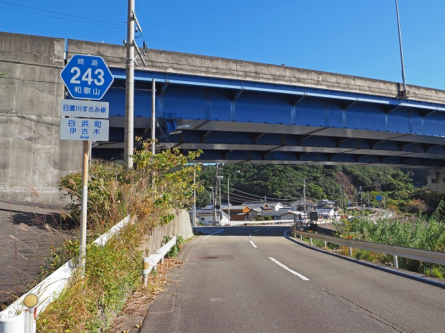 ここらは走ってる。左の写真は日置川の旧国道の橋、県道243号になったが「のっぺらぼう」の県道ヘキサ、2014年のストリートビューでは数字見えます。