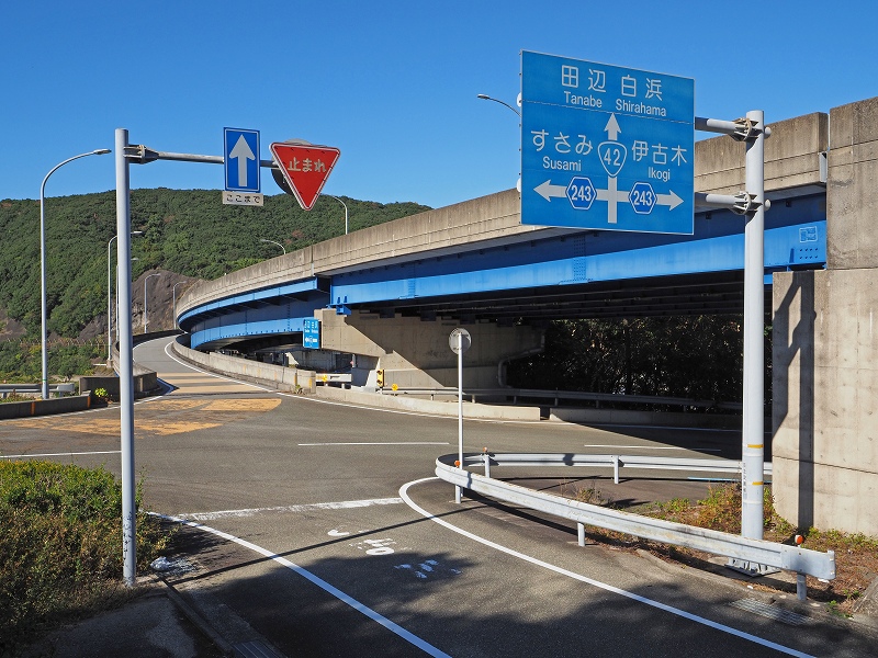 国道と県道の案内標識がある交差点なんだけどクルマ来ません。現状国道42号もすさみ町の江住までは無料の紀勢道と並行してるので旧道みたいなもの。