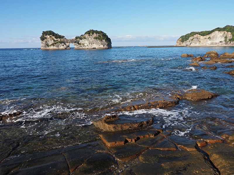 見た目実に頑丈な円月島、画像検索していっぱい出て来そうな撮り方じゃなく自分らしい撮り方、右にも円月島と同じテイストの岩が見える。