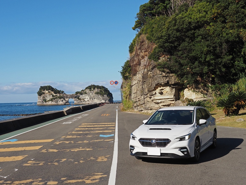 こんな感じで撮ると円月島が近く見える、撮影ポイントから円月島は500mの距離になります。ボクにとって「クルマと一緒に白浜ですね」というポイントはここくらいなんで