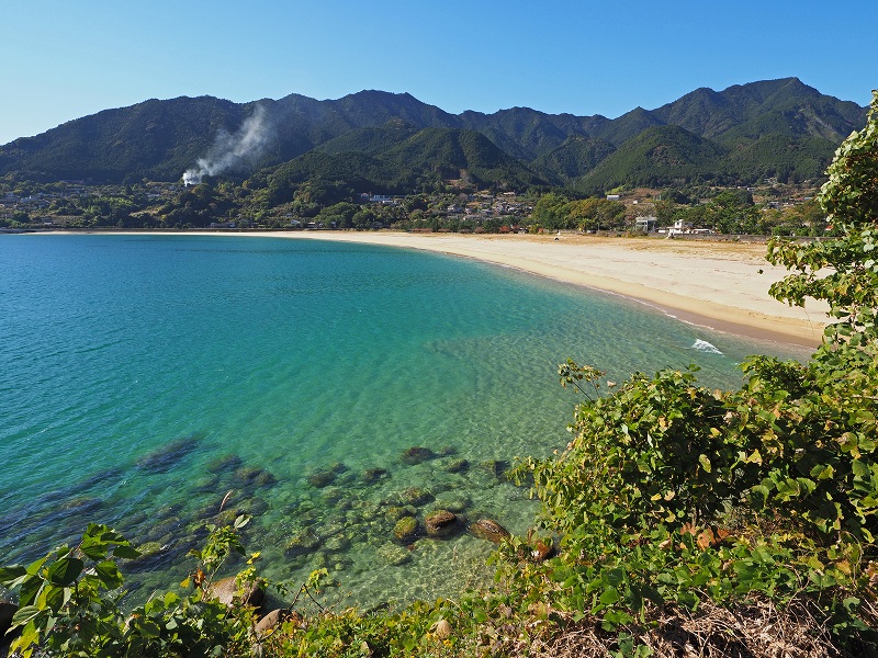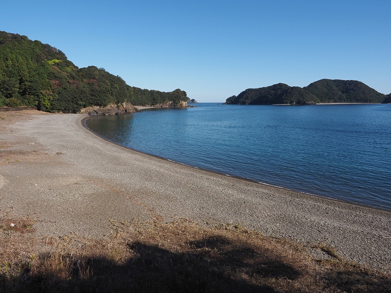 熊野の大泊(おおどまり)町の砂浜が見えるところ、対岸の左端に見えるテル部分が鬼ヶ城、この写真だと白く見えないかもだけど小さく、新宮から太地町の陸地が
