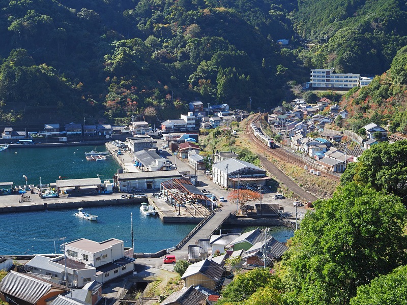 国道311号から二木島(にぎしま)の漁港、駅を見ていると...お、特急「南紀」ですやん。ボクは駅が観光地でもあるのでよく行きます。